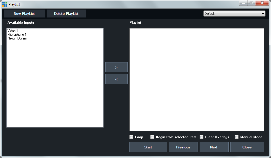 Select an input from the Available Inputs column and click the > arrow to add it to the Playlist.